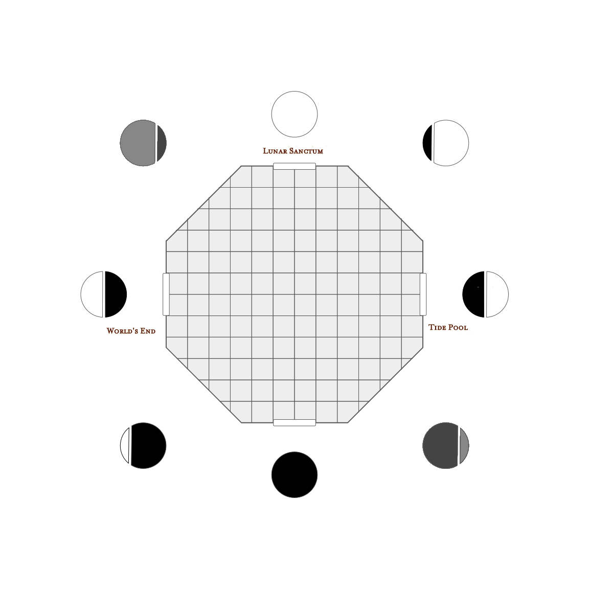 In order to proceed, the pack must retrieve the missing Waxing Crescent and Waning Gibbous disks. Once they are placed in the correct sockets, the iris ceiling of the center chamber will open slightly, casting a beam of moonlight 5 ft. in front of the door.