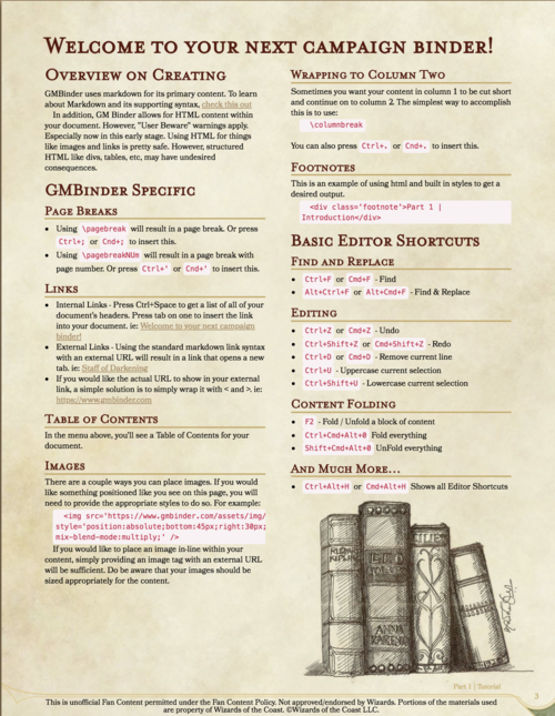 In this lesson we are going to focus on using GM Binder to layout your content. This lesson will touch on many of the basic features of GM Binder, and should leave you confident in creating your own module documents. With over 37,000 documents having been created and published within GM Binder, we'll also cover a handful of tips that help to ensure better readability for your users. Designing documents can be intimidating, and GM Binder has a lot of functionality built in, but it really is pretty simple to create a very readable document with minimal effort.
