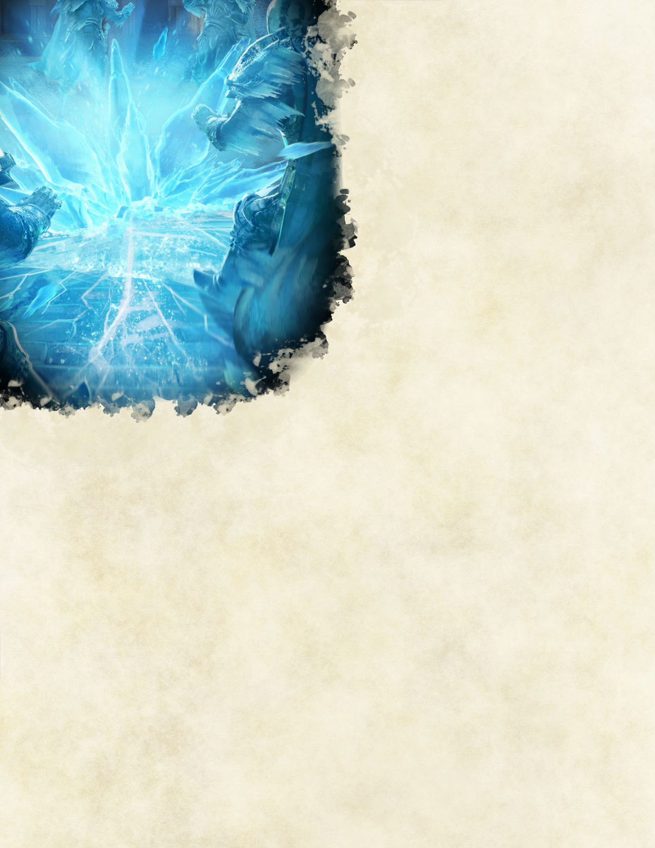 Encase yourself in an impenetrable tomb made from slabs of translucent ice fixed to the ground. You are protected as if with an otiluke's resilient sphere spell, but you cannot move or be moved. A spherical zone of permafrost and frigid winds, with a radius of 30 feet, emanates from you and spreads around corners. All creatures in the zone must succeed a Constitution saving throw or receive 12d8 Cold damage and become Frozen, regardless of how many dice of Cold damage it receives. Those that succeed receive half damage.