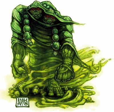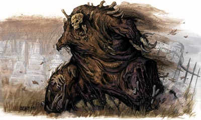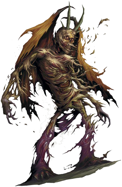 "A repulsive, extremely tall, humanlike creature with long, rotting wings and peeling flesh, this monstrosity continually sheds rivulets of filth and decay, creating a pool of rot in which it stands."