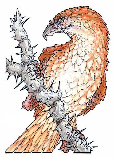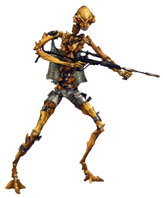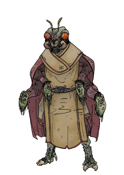 Yam'rii, also known as Huk, are a sentient species of insects with mantis-like bodies, large, multifaceted eyes, thin torsos, knobby carapaces, and pointed feet. Their arms are shaped like giant clippers: the upper limb has a barbed, serrated cutting edge on its underside, and the lower part of the limb narrows to a point; together, both halves act like shears. They are strong, burly creatures, although they remain stealthy despite their size. Yam'rii are carnivorous, subsisting on meat and eggs—and, according to rumor, their own kind.