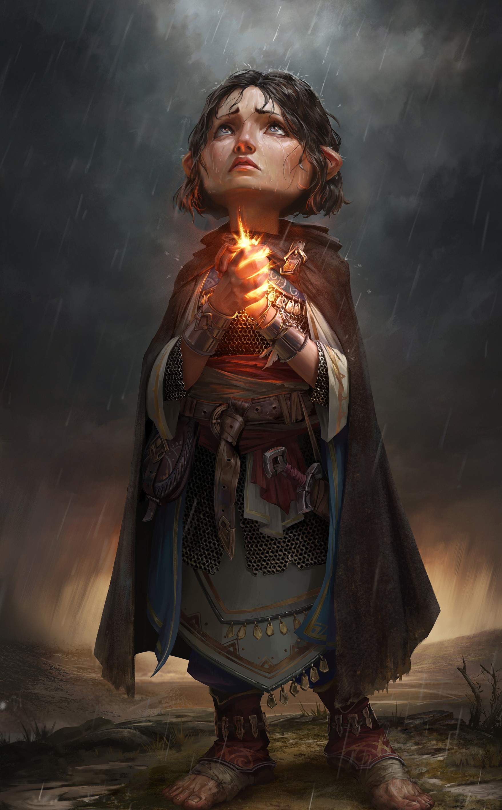 Closest in disposition to their lightfoot cousins, starheart halflings tend to abhor the violence which saturates the world around them, much preferring the joy found in a cup of tea or pint of ale with friends. Seeking answers to bring peace to those in need, these goodfolk look to even the most distant stellar sources for inspiration and guidance. Blessed with celestial favor, these halflings walk the land with the protection of the stars themselves.