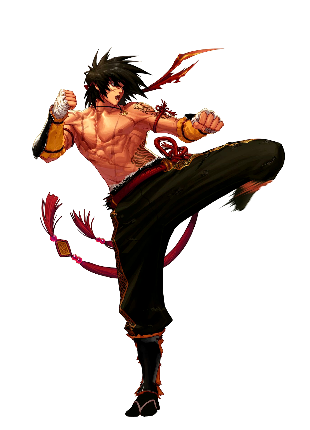 Taking a deep breath, a human covered in tattoos settles into a battle stance. As the first charging orcs reach him, he exhales and a blast of fire roars from his mouth, engulfing his foes.
