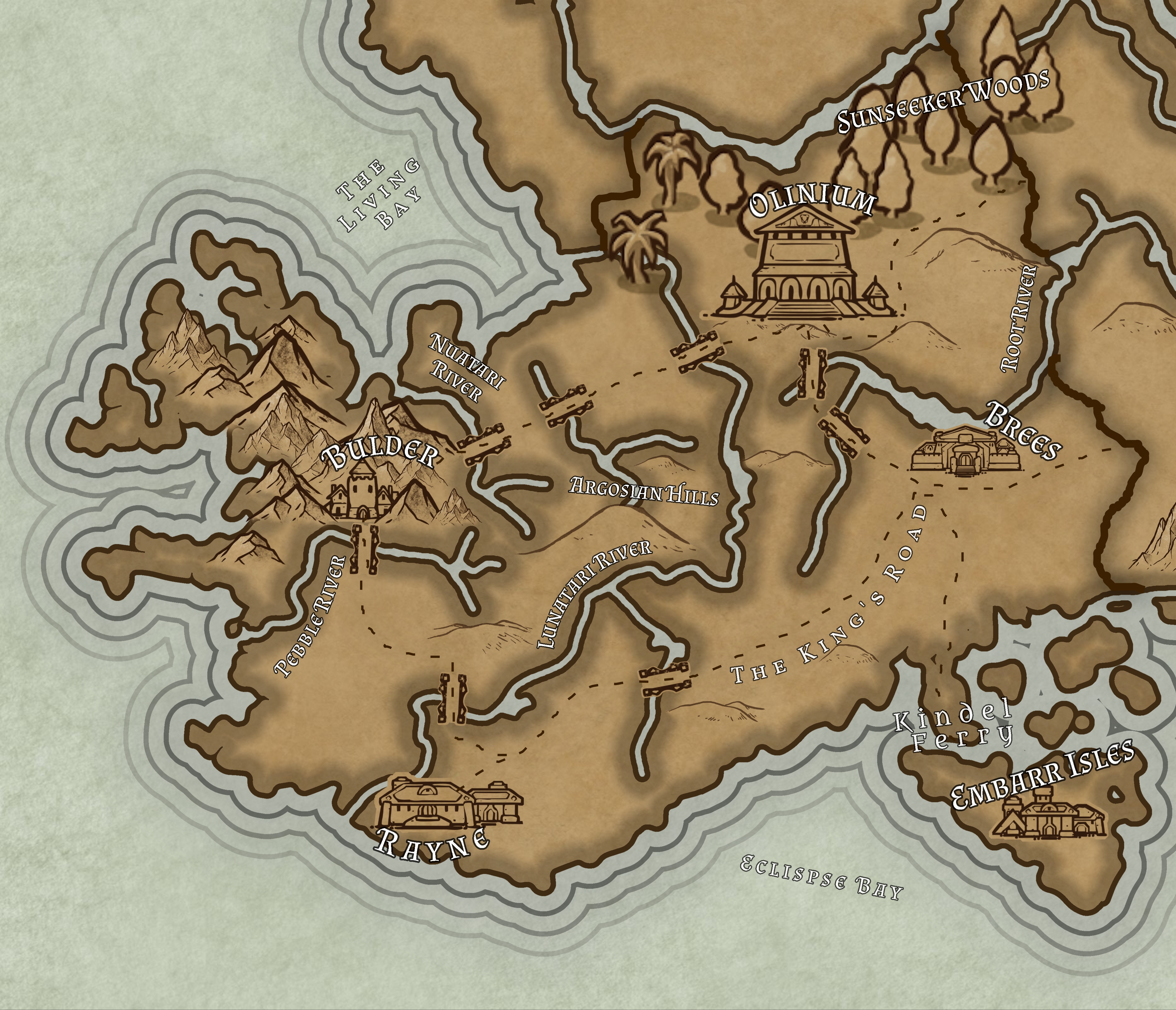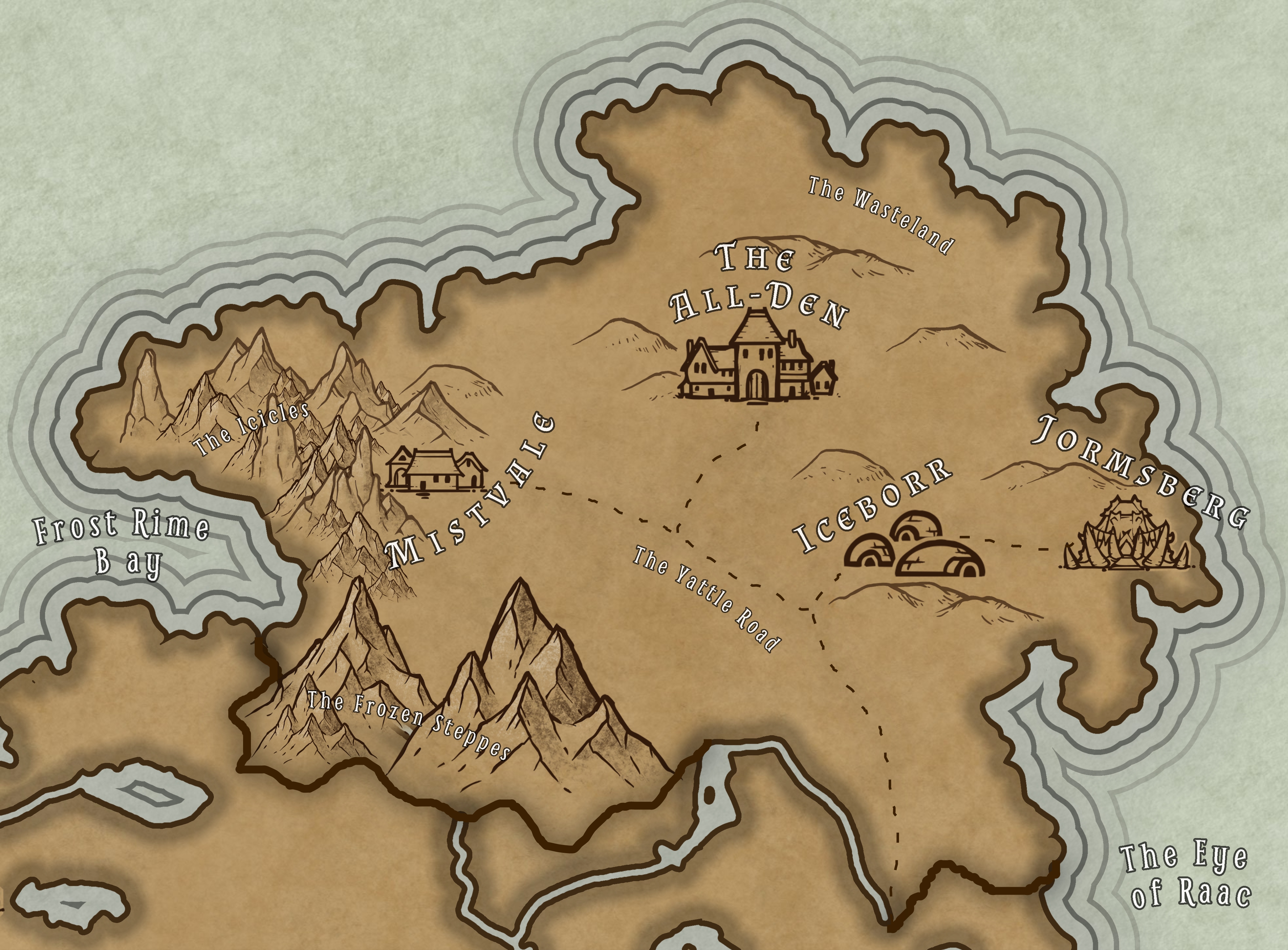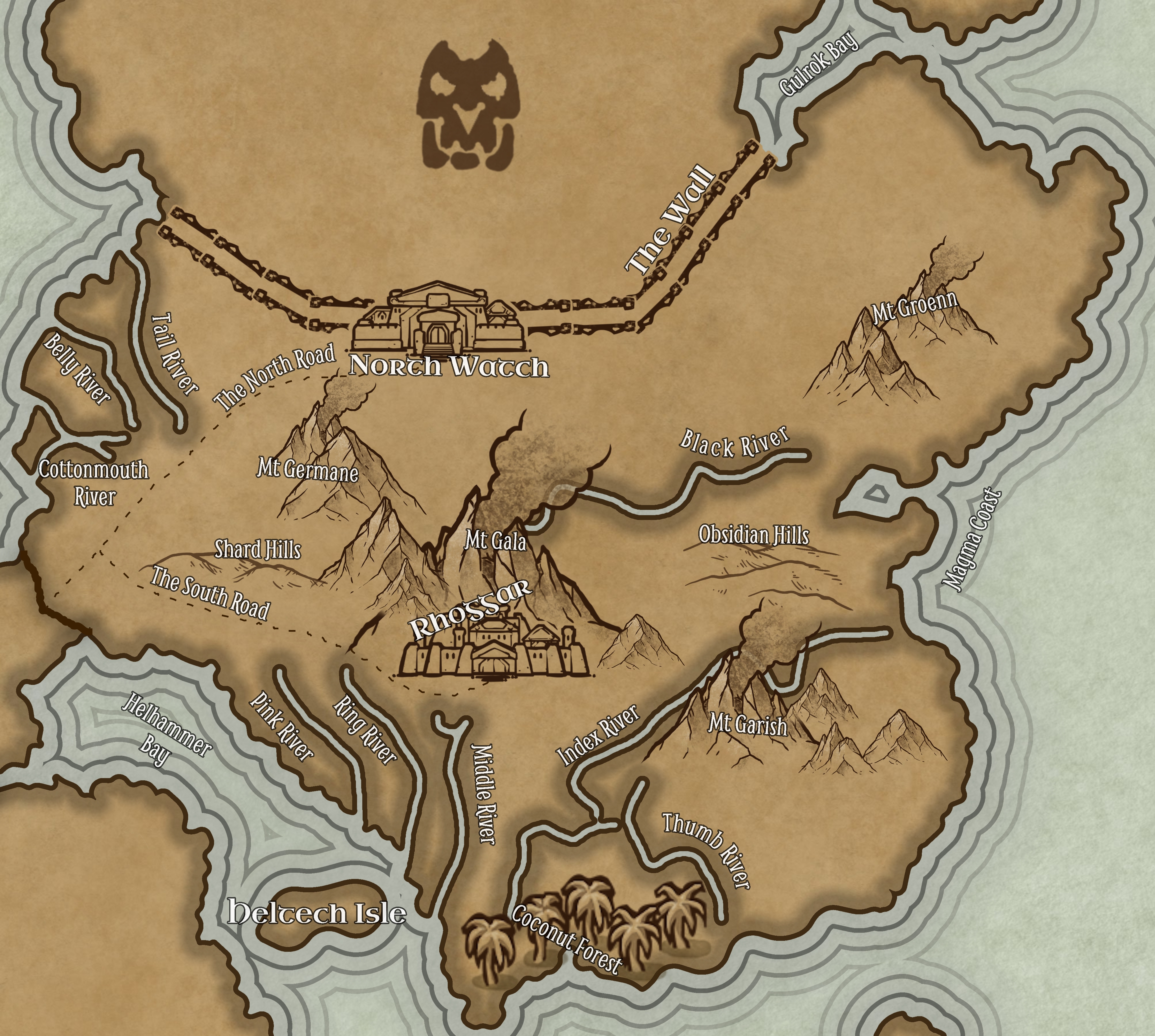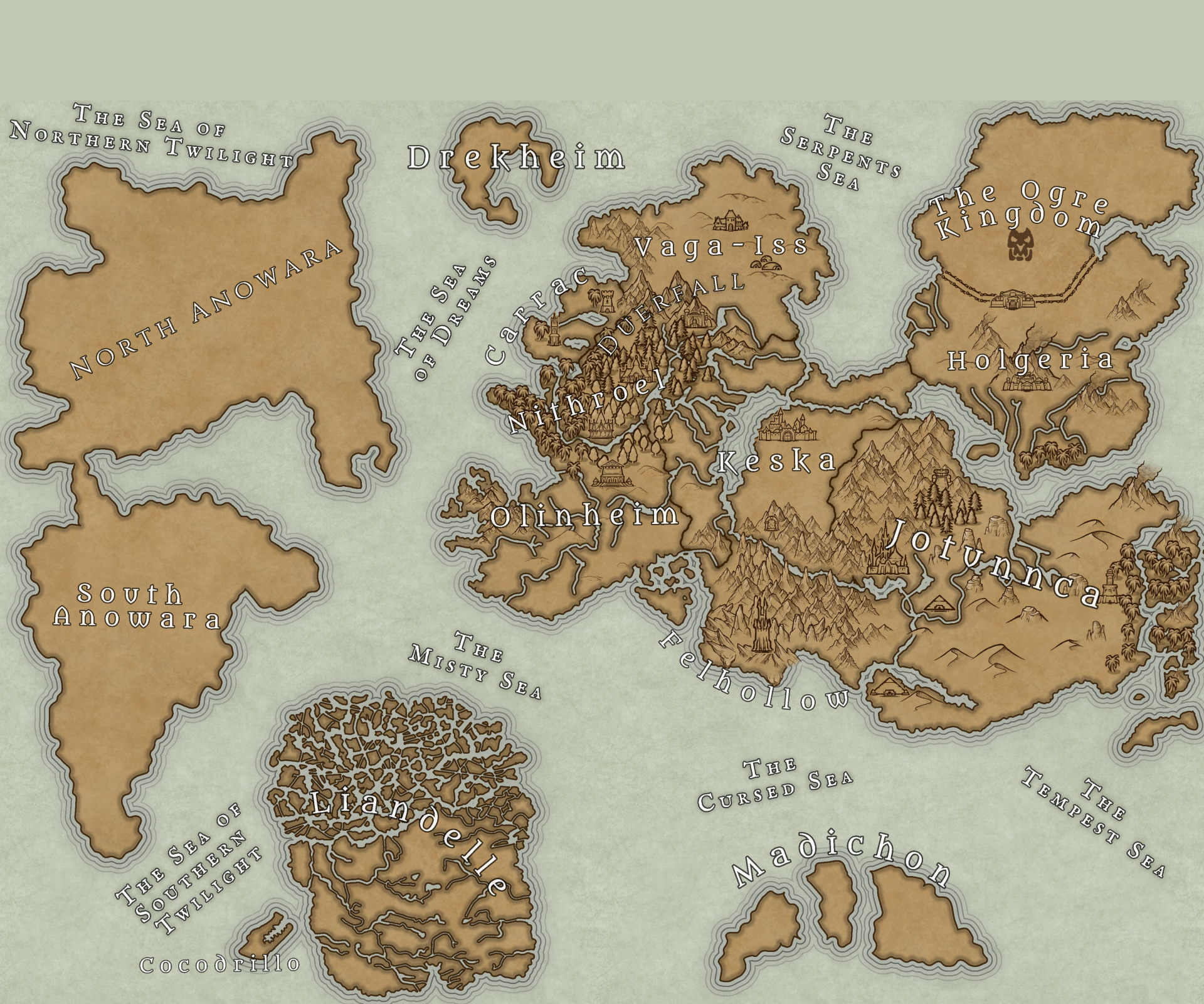 Though there are many continents cultures and countries on Midraholm the focus of the game is on characters from the "nine realms," which make up the super continent of Olin. These realms include Vaga-Iss, Duerfall, Carrac, Nithroel, Olinheim, Felhollow, Keska, Holgeria and Jotunnca. You may notice alot of blank space on the other continents such as north and south Anowara. This is due to the lack of exploration in the continents by the Olin people. As the adventures go in I suspect more of these maps will be filled in. But there is no telling which way your adventures will take you. Any "one offs" and other such adventures have already unlocked portions of the map in which these adventures took place. Essentially I loved the idea of creating this world together.