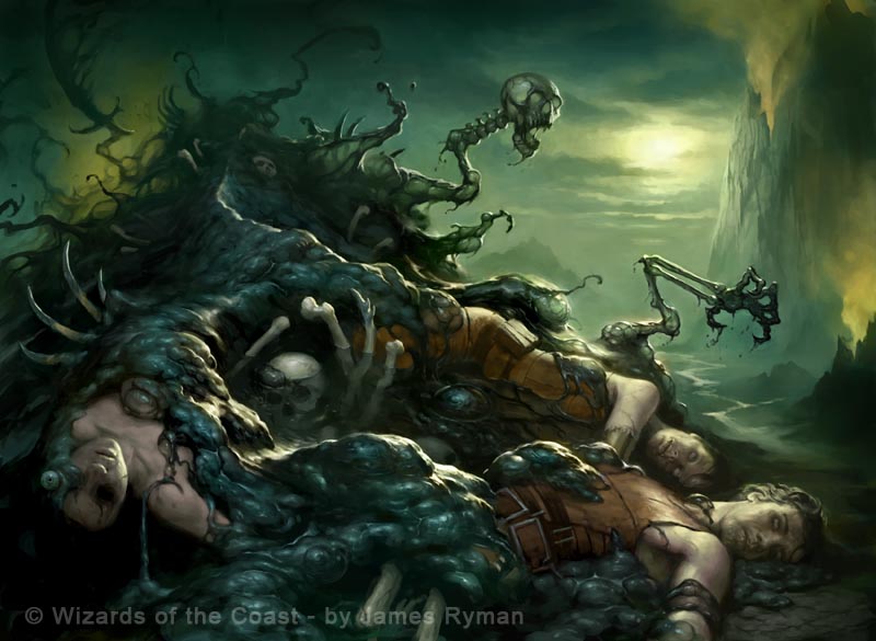 However, their most dangerous feature is their metabolism. Each times the necrotic ooze consumes the life force of a creature, it immediately stimulates rapid cellular growth causing the necrotic ooze to create a smaller clone of itself. However, this feature only seems to work when the ooze kills a living creature, most likely due to the potency of the necrotic energy from its life force. Because of this, one should take special care to remove a necrotic ooze from civilized areas are quickly as possible or risk a potential infestation of necrotic oozes.