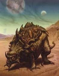 In the broken crags and tiny caves of the barrens lives the timid baazrag. Two feet long or less, it is one of the smallest omnivores in the stony barren regions. The baazrag’ s face is protected by a bony covering that reaches down on either side of the head and across the nose, with holes for the creature’s nostrils and eyes. The mouth and lower jaw are not protected below the bony covering. The beast’s humped back is covered with a hard, natural armor that protects the animal, especially the fluid storage sack just beneath the shell. Its four legs are comparatively frail but are adequate for darting from shelter to shelter around its rocky home.