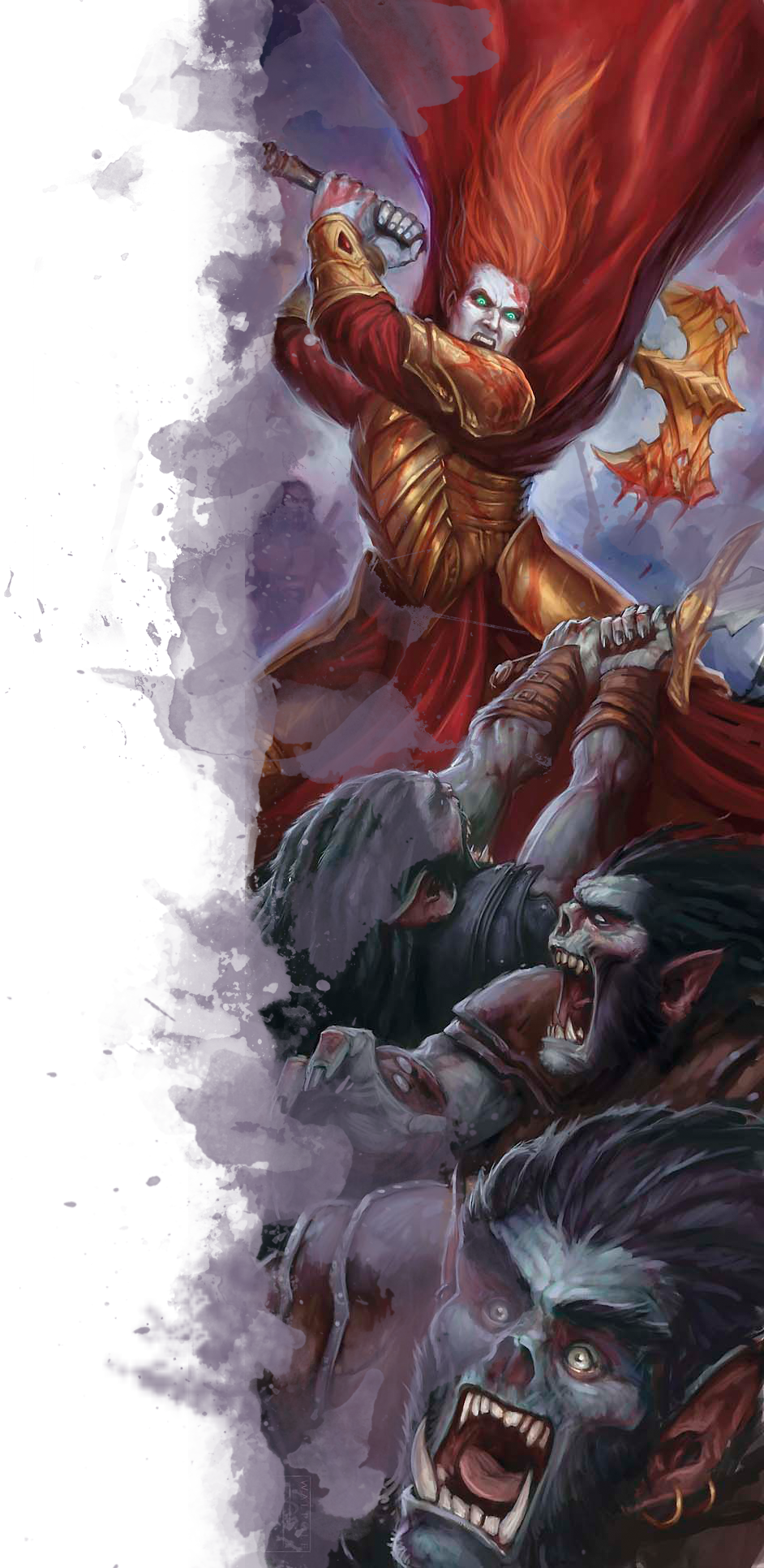 Vrylokas favour clothing that reflects their ancient origin, from layered robes and tall head-dresses to long jackets and trousers, or bodices and skirts. Their garb is often embroidered with bloodred roses and thorns—symbols of the Red Witch. They favour red with accents of brass and black. Their weapons and armour are uniformly ornate and flamboyant, with spikes and flourishes of rose motifs and rubies.