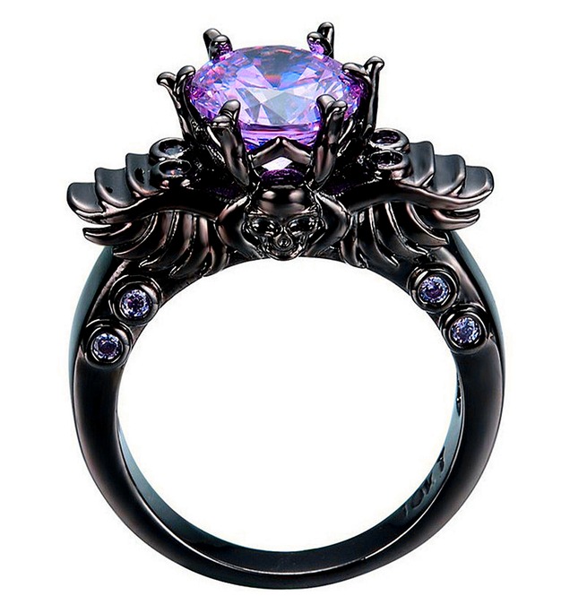 Ring of Necromancy: Black Gold Filled Winged Skull Ring with Purple Cubicic Zirconia on Rebels Market