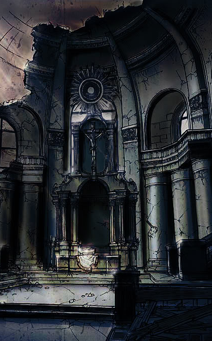 Within the Cathedral's main hall resides an Undead Giant Spider (Appendeix A) which is hidden in the blackness above the church pew. If any characters trips on its webs it is alerted to their presence regardless of stealth rolls, Otherwise, With sufficiently high stealth and perception checks (player's perception vs. the spider's stealth roll) the characters may be able to surprise it, but more likely they will be surprised by the hidden spider which will attempt to sneak attack them.