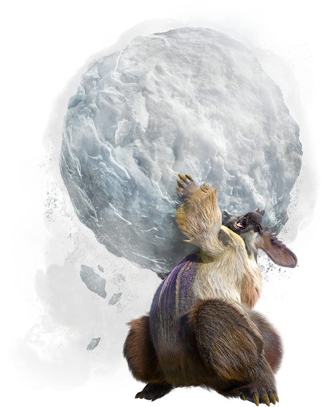 A large, wombat-like Fanged Beast. Its ears are long and highly sensitive, and its face features a beak-like mouth along with small red eyes. A Lagombi's belly is made of a low-friction material and is shaped so that it can slide upon the ice like a sled. It is covered in a thick fur coat to keep it warm in its sub-zero homeland.