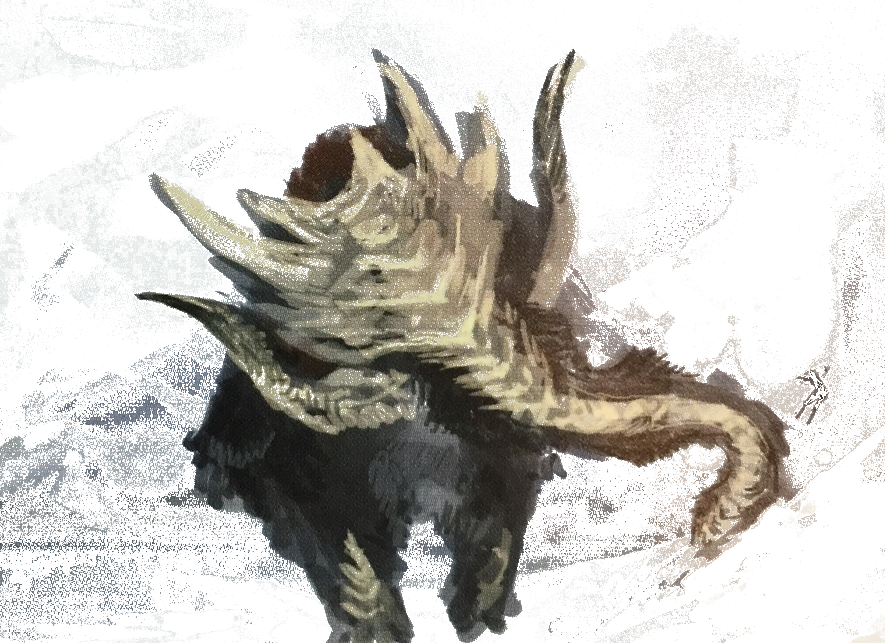 "Found in the most frigid regions of the world, Gammoths are behemoths with massive tusks. Though they are herbivores, when provoked they will leverage their enormous weight and trunks to crush a threat. They can also shatter the snow covering their legs to damage nearby foes."