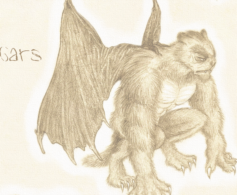 Gars are large bipedal bear like creatures with massive bat wings that protrude from their back. There chest and stomach are absent of fur and tend to be pink in color from the constant smearing of blood on this region of its body. They are normally between 9-12 feet tall with a wingspan of close to 15 feet when fully extended.