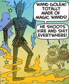 One of the many absurd dazzling and wondrous creations of the duo of Gnome inventors known to this day only by their artistic name, "Fukken Dwarves", a wand golem is made of an assortment of magical wands welded, stapled, glued or tied together in the duo's typical haphazard ingenious way.