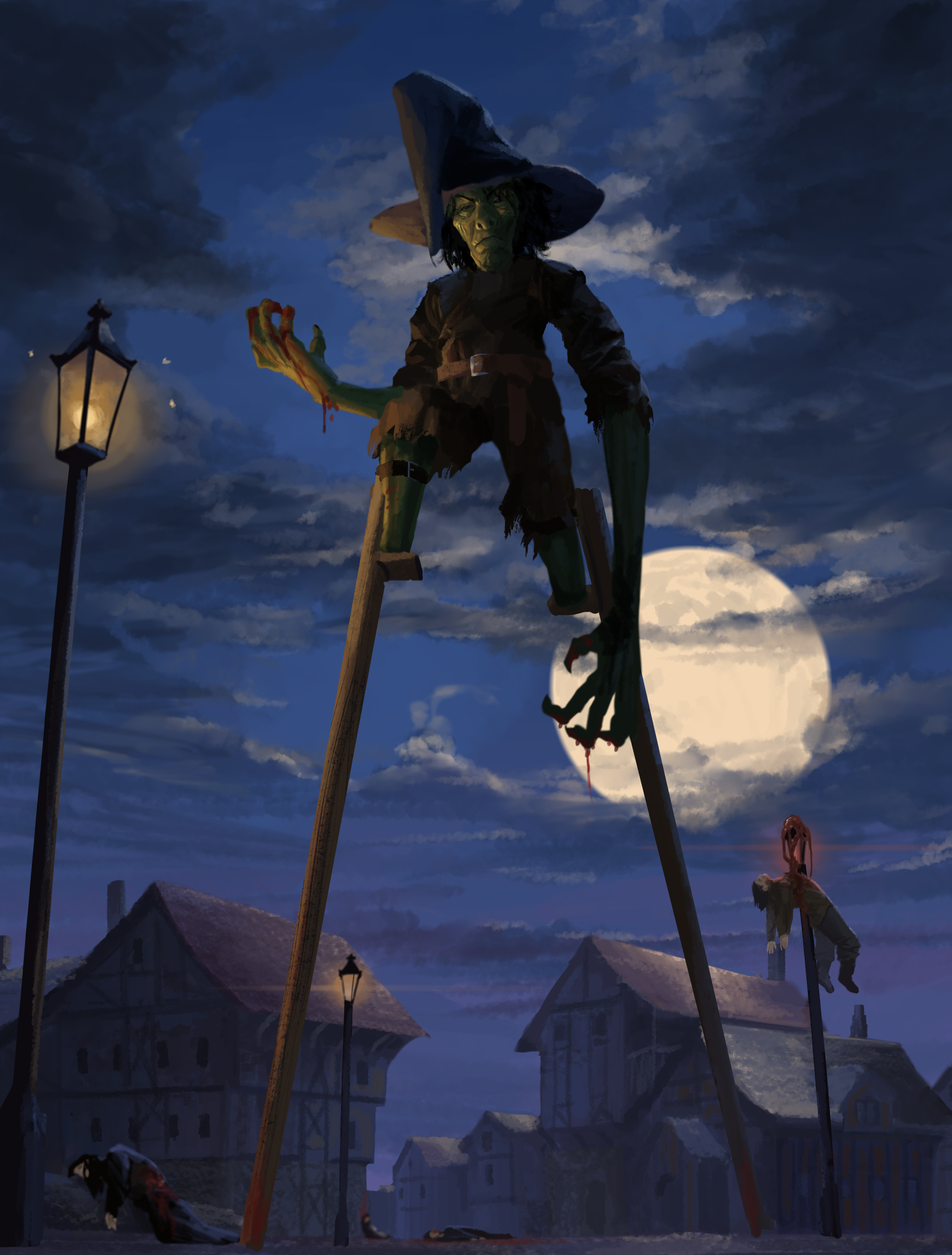 Much time had passed, just enough for the town to almost forget about Old Man Grumple, when they recieved a ghastly visitor. A tall, shadowy figure stood at the edge of the village. He was the height of a man, but his body was small, and his legs thin and spindly. Townsfolk were impailed on his wooden stilts, as the visitor trampled through the village. People succumbed to plagues in an instant. Others simply eviscerated, by claw, or even a simple look. The village was reduced to shattered homes, and bloody corpses. And Old Man Grumple went for a walk in the woods.