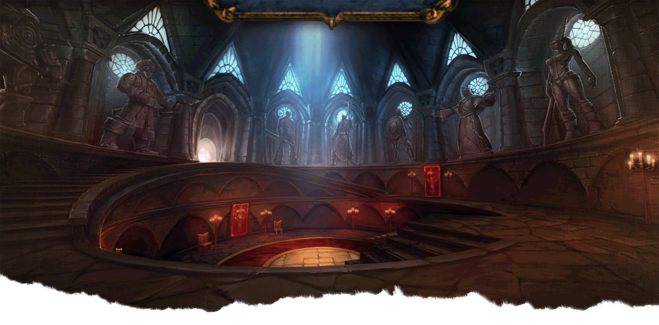 A archway built into the northern wall of the cloister leads down into the Footman's Armory. Informed of the party's coming, a phalanx of eight Scarlet Defenders form a phalanx blocking entrance down into the next set of chambers. The phalanx grants them all 3/4 cover and resistance to all melee damage.