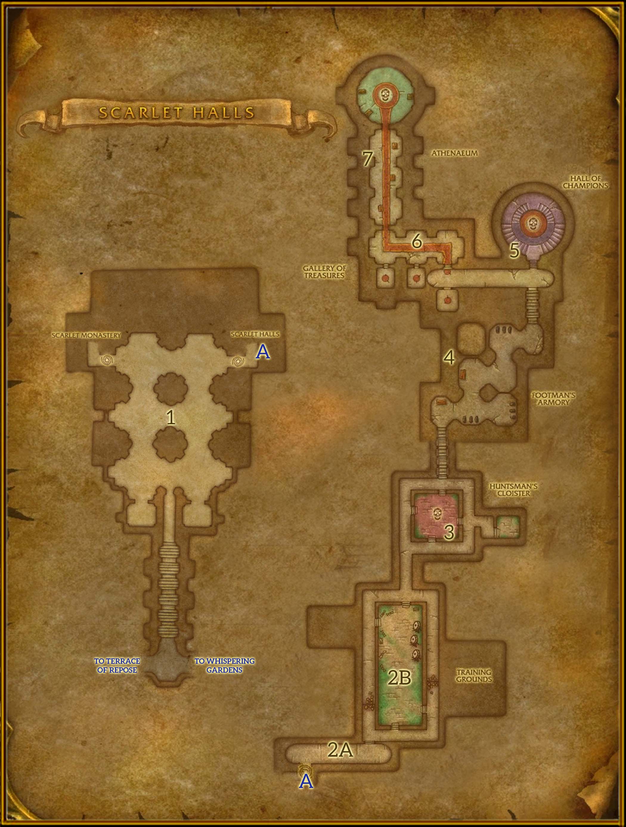 The Scarlet Monastery is one of the last strongholds in the world belonging to the fanatical Scarlet Crusade. The Scarlet Bastion within the ruins of Stratholme, the town of Hearthglen, the town of Tyr's Hand and the Scarlet Enclave all fell during the last years. Located in the northeast corner of the blighted Tirisfal Glades, the Scarlet Monastery was once a cathedral to the Light, taken over by zealots.