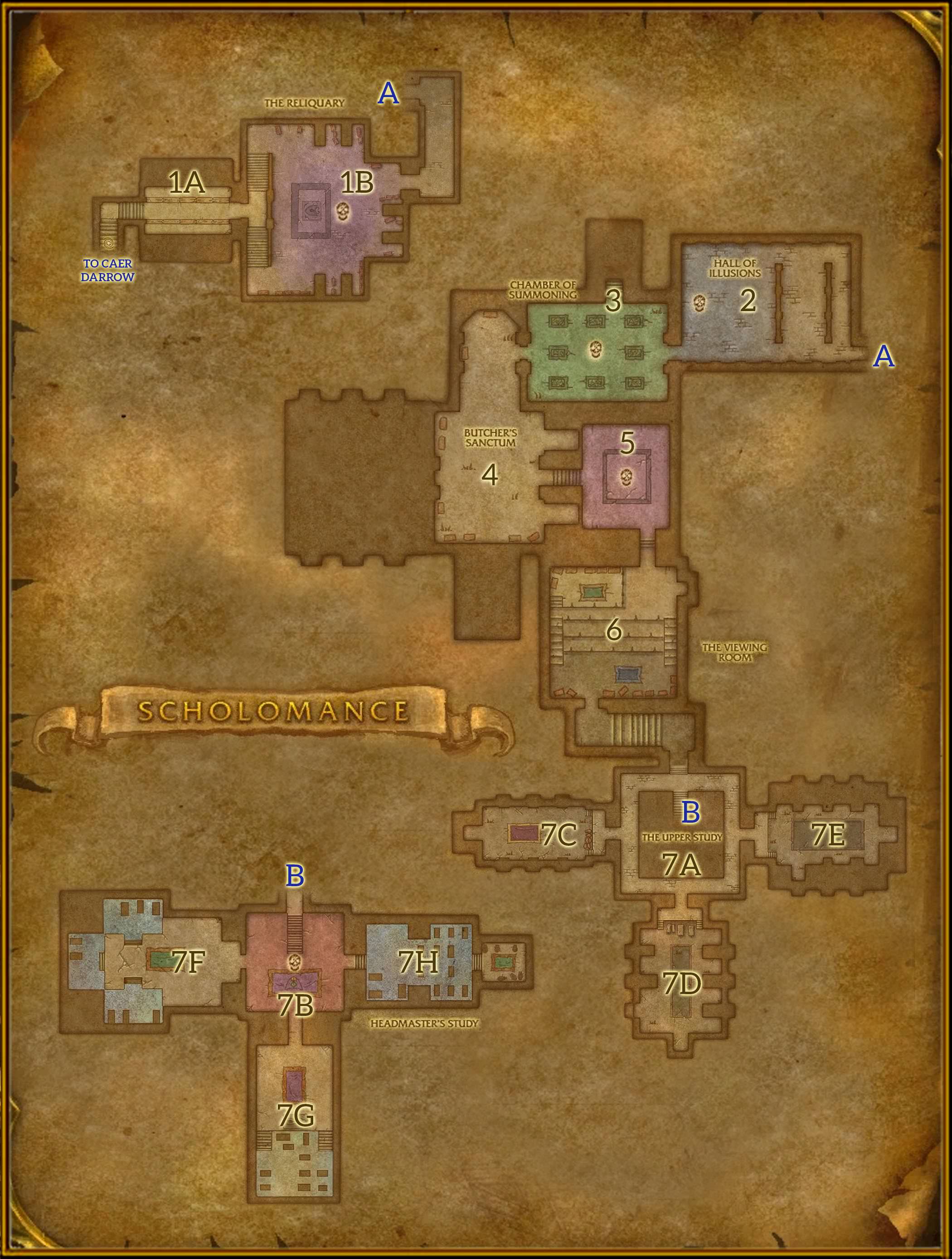 Founded by the rogue wizard Kel'Thuzad nearly ten years ago, the Scholomance is housed within a series of crypts that lie beneath the ruined keep of Caer Darrow. Once owned by the noble Barov family, Caer Darrow fell into ruin following the Second War.