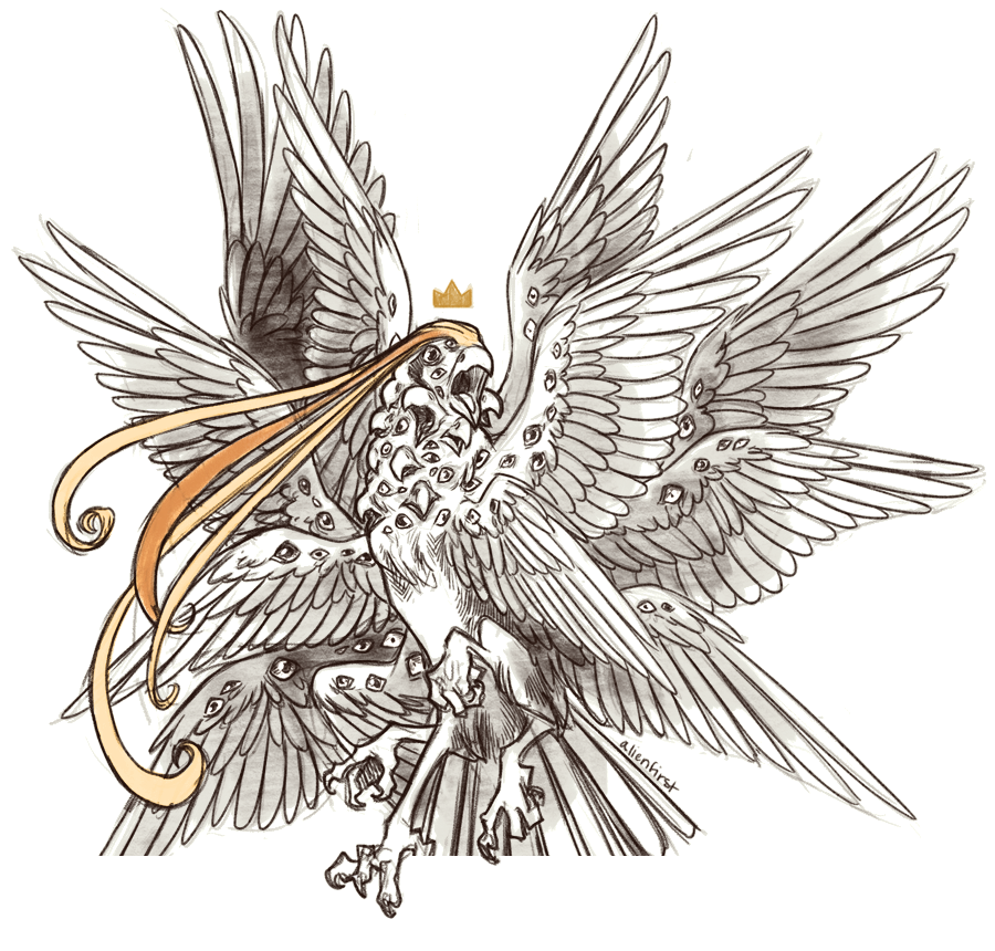 Fifteen feet tall and just as wide hovers a alien creature. Twelve brilliant wings emerge from a white-feathered body with four legs and fifteen beaks. It descends slowly, stone cracking underfoot as it comes to rest, its shadow twisting up from the ground to stare forwards too.