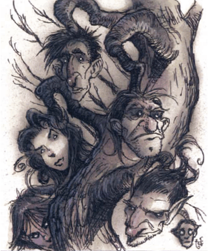 A Death's Head Tree is a species of Dread Plant. Its seeds germinate on soil where copious amounts of blood have been spilled. Battlefields and temples where sacrifice of living creatures were performed are fertile soil for the Death's Head Tree. On average, it takes around fifty-five years for a Death's Head tree to germinate and grow into a size where it can bear its fruit, the eponymous Death's Heads. Each of these appears to be a severed head of any of the standard human and demi human races, except for the fact that each head grows from a branch of the tree and is attached to the branch at the neck. The tree, is immune to fire and fire-based magic which will create a nasty surprise to those who first encounter it. In time, these heads ripen and “fall” from the tree, actually floating away on organic gases, seeking the bodies of warm-blooded creatures in which to plant their seeds. The tree can move its branches to attack and defend, and in this effect it can use its Deaths Head fruit to attack, by biting. These bites are capable of inserting seeds of the Death's Head Tree into the flesh of the victim, which if left untreated will quickly germinate into another Death's Head Tree in hours, and killing the host.