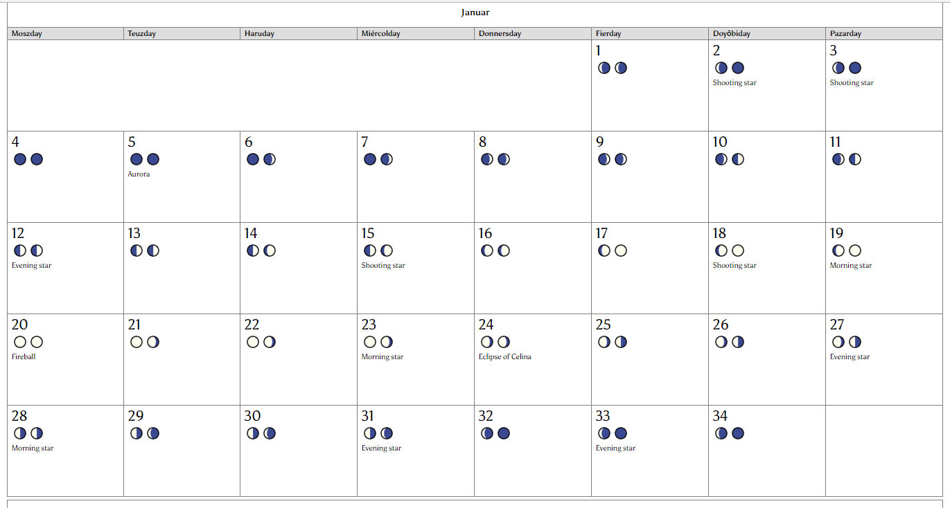 The Soltian calendar divides the months into four weeks of 8 days, with two extra days during the month that correspond with new and full moons.