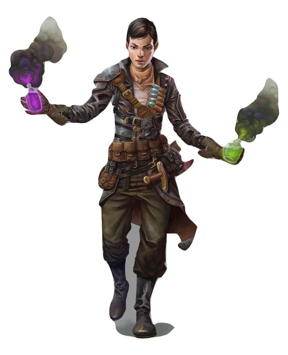 However, many seek to reach their goals in different ways. Some artificers are engineers, crafting wild mechanical servants and designing elaborate machines. These Artificers are students of invention and warfare who craft deadly firearms that they can augment with magic. Other artificers are alchemists. Using their knowledge of magic and various exotic ingredients, they create potions and draughts to aid them on their adventures.