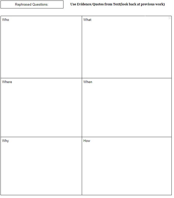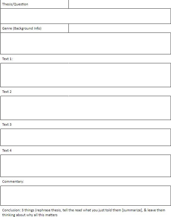 These graphic organizers are meant to act as the bare minimum of what you need. Please make sure that you are fully answering the question with support from the text (evidence), you explain how the evidence connects to your answer(thesis), and you are clear in your description of your thought process.