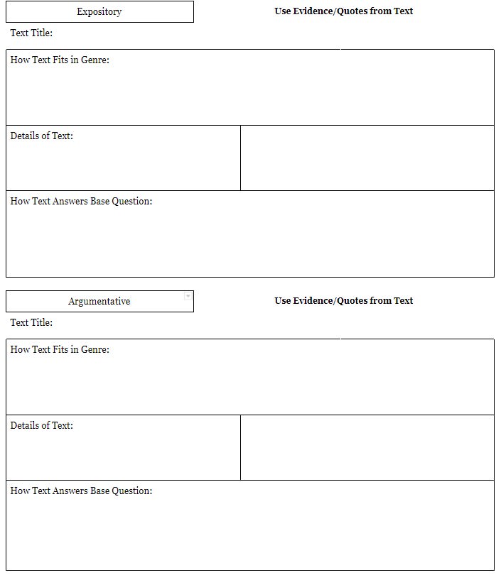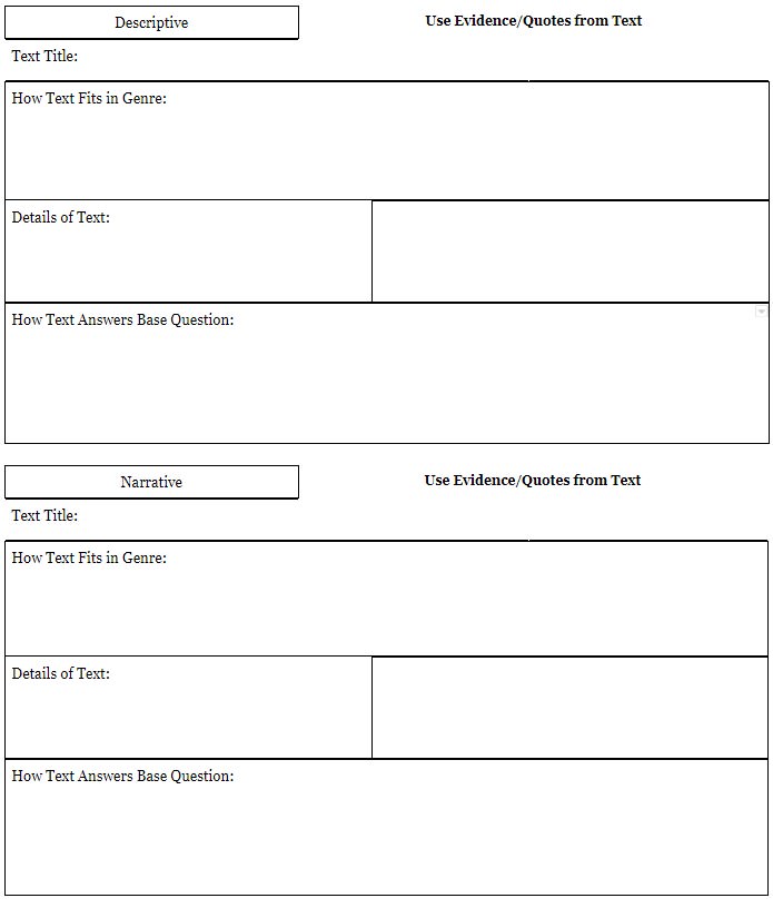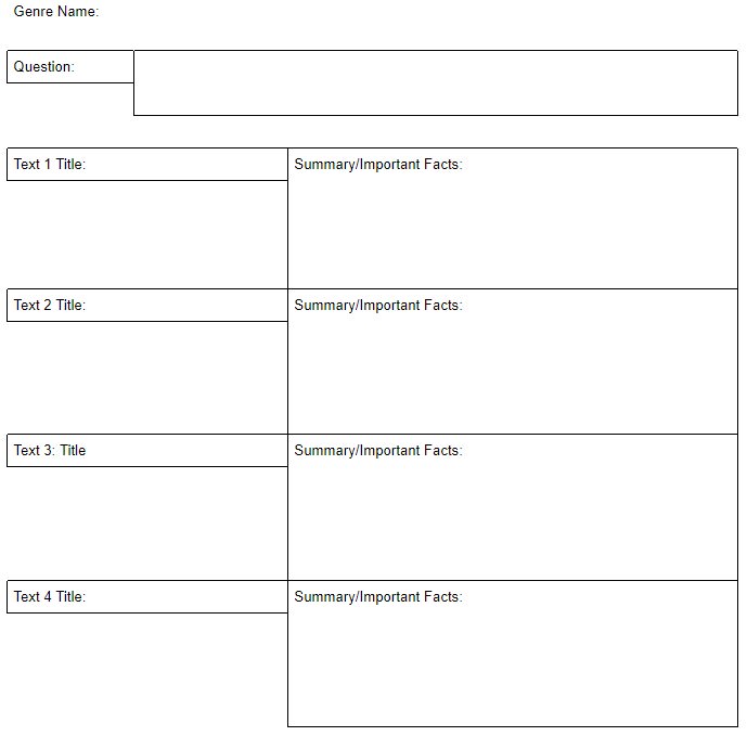 | 1. Fill out the first page of the Graphic Organizer - your Genre Your Question, Titles of your Texts, and Summaries relating text to your question |
