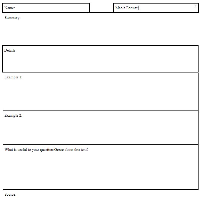 - At least 4 texts, one of each type, from the genre, details on selected text including a summary, examples that prove its a specific type, connection to question(s), and any other important facts, including source information (Task 2.2)