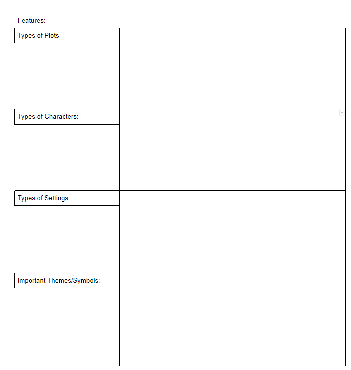 For your project, the best place to start is to decide what Genre you wish to examine. While there as varied ways of categorizing texts as there are texts themselves, we will be keeping it simple for this project.