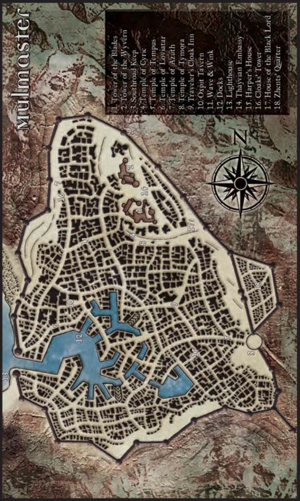 “With mountains on three sides and the Moonsea on the fourth, the city of Mulmaster is cold and windswept. Frequent snows leave little natural greenery, except where the rich buy it. In this bleak landscape rises one of the most powerful cities of the Moonsea. The rich luxuriate in the benefits of their station, while the poor suffer in fear of their betters and the tyranny visited upon the citizenry.”