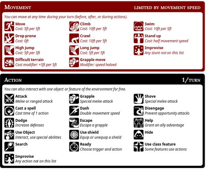 | Staff | Free | A stout branch cut from a tree and smoothed for use. A staff does 1d4 bludgeoning damage. Can't use with a shield. |