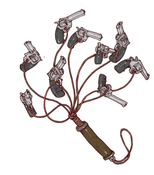 This whip has nine ends, each of which has a revolver wrapped around it. When you hit a creature with this whip, you can choose for all of the guns to fire, forcing all creatures within 20 feet of the original target (including the target) to make a DC 17 Dexterity saving throw. On a failed saving throw, a creature takes 9d6 piercing damage, or half the piercing damage on a success.