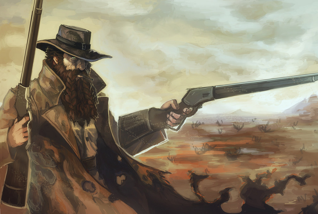 A single bead of sweat breaks out on the halfing's brow as the noonday sun beats down on her, and her fingers flex inches from her gun holster. This damn gnomish revolver had better not crap out on me again. A sudden a flash of movement, a thunderous bang and a plume of sandy dust is thrown into the air. "Damn humans think they own the place," she mutters.