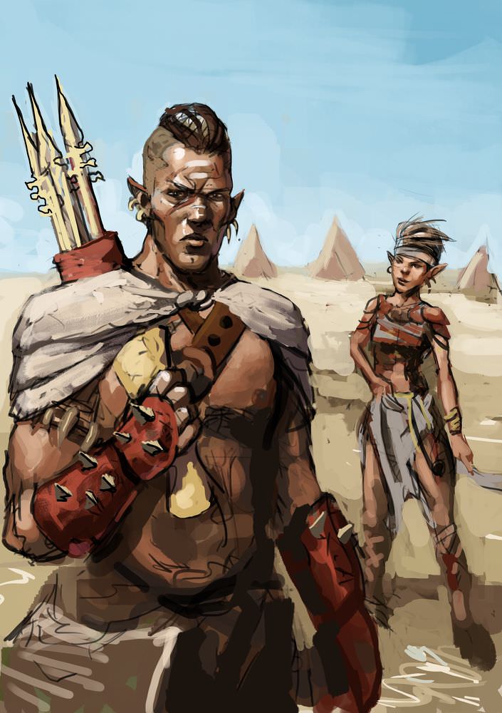 On the frontier, wood elves feel most at home out in the plains, or trekking through the desert. They tend to live in tiny settlements of only a few dozen elves, naming their newfound clan homes after nearby natural phenomena. However, they occasionally dwell in the larger settlements scattered across Eanna, working as trackers or herdsmen.