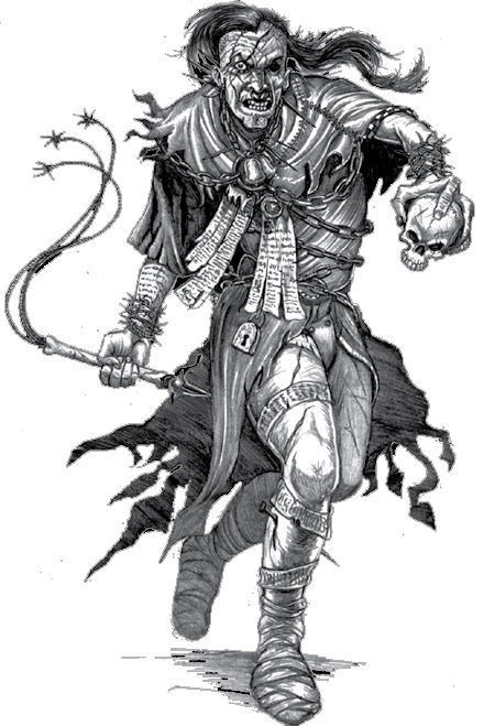 A wide-eyed, insane human rushes towards a group of charging orcs with a flail in hand. Frothing at the mouth, awash in his own blood and castigating himself, he shows no sign of slowing down. The orcs pull to a halt with fear in their eyes to defend themselves against the zealous warrior.