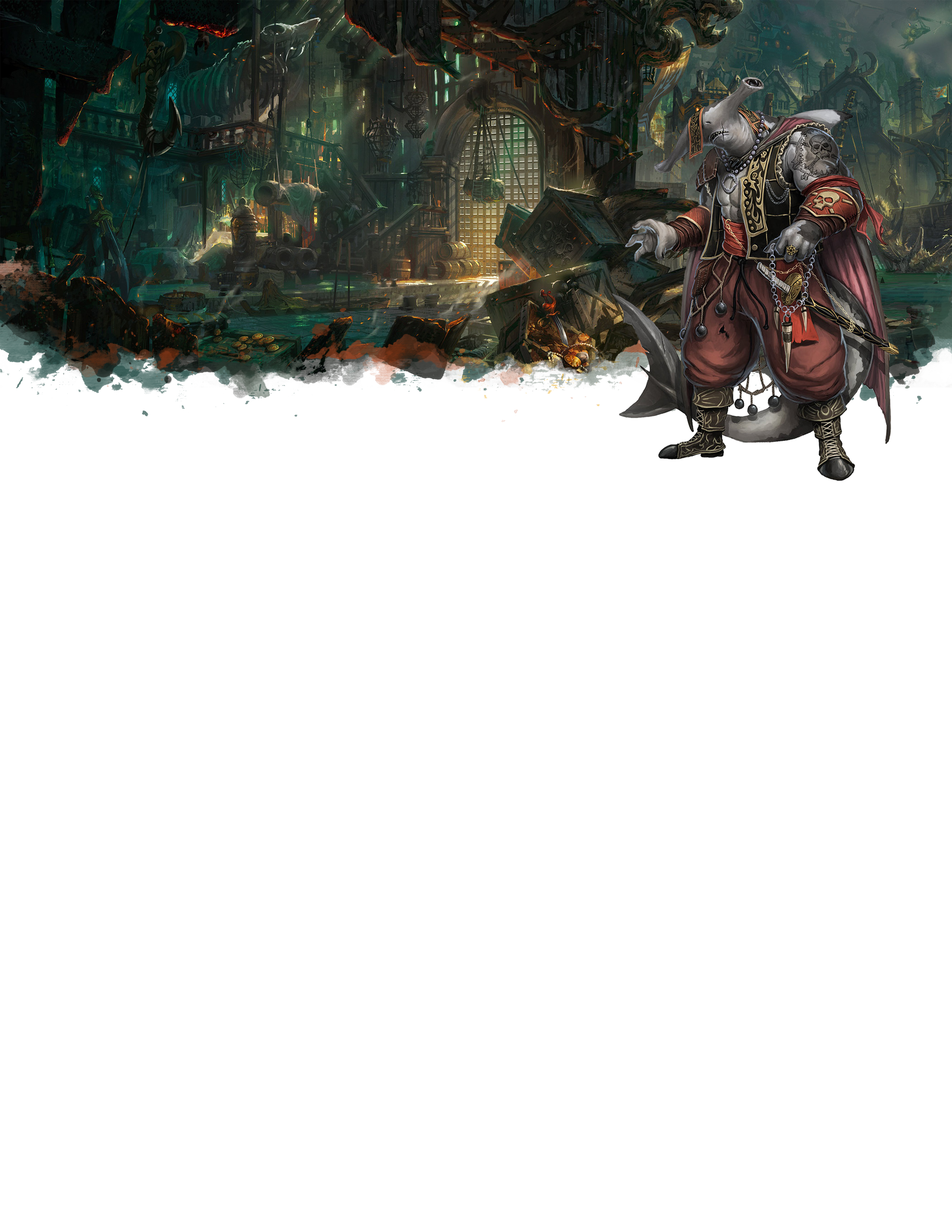Within rocky coves and coastal inlets, praedaren build their dens. Atop the blood-soaked docks these creatures call home, carcasses of great sea monsters are hoisted by net and harpoon, and the stench of iron and salt permeates the air. Longshoremen work tirelessly to load and unload their vessels, harvest the remains of slain beasts, and repair or dismantle ships that have been salvaged or captured by competing fleets.