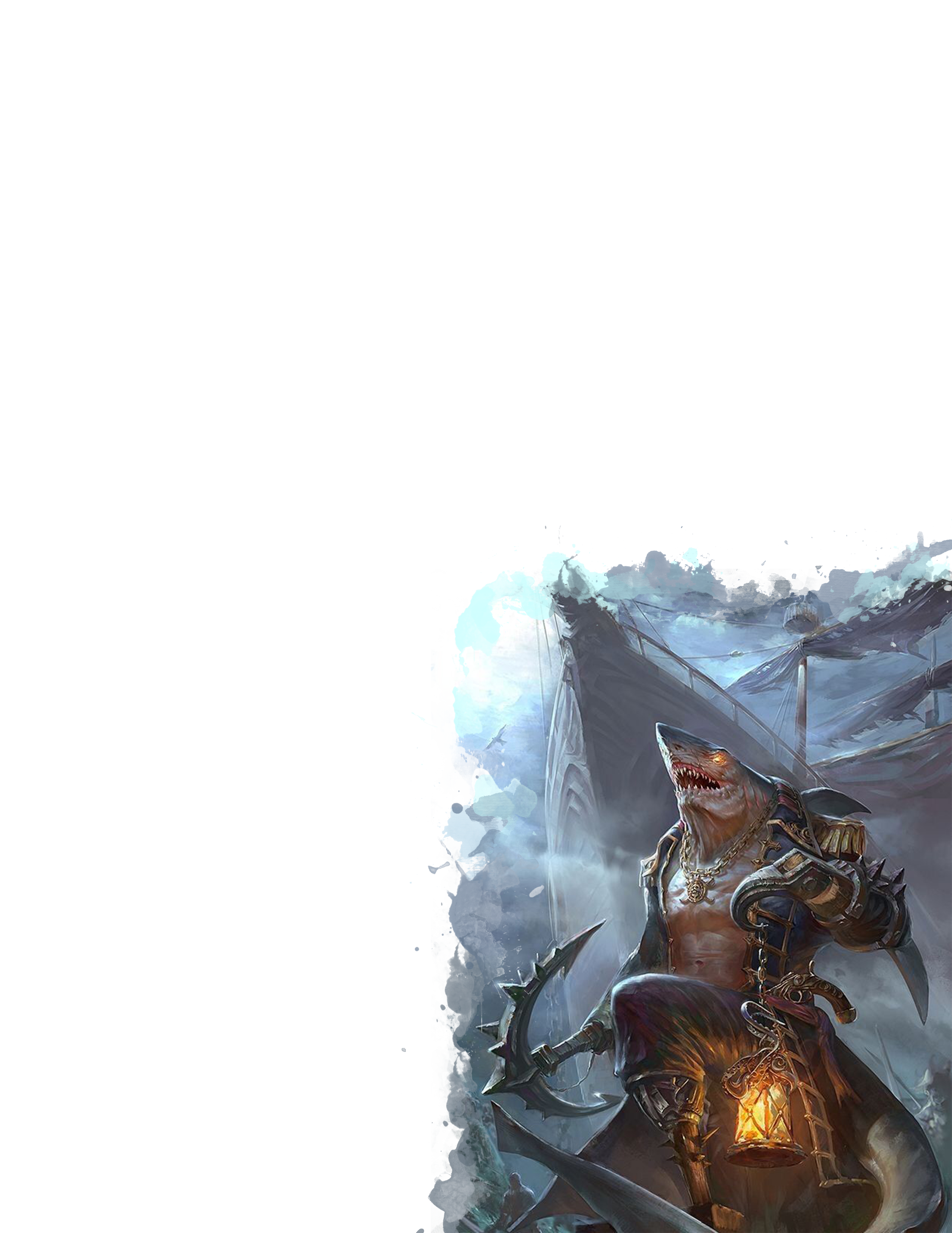 Praedaren are mutinous spawn of the shark devil-diety Sekolah, sculpted in his own image. Under his servitude, they acquired their taste for conflict and plunder, as they were tasked with ravaging Sekolah's prey. Despite the pleasure that praedaren experienced in his service, they were discontent. They sought freedom; freedom to form bonds of kinship and friendship, freedom to build their own society, and freedom to do as oneself desired. And so, once the opportunity arose, the praedaren escaped the clutches of Sekolah's influence, and fled his domain beneath the depths. To this day, the praedaren hold dear their hard-won freedom, and are regularly at odds with those who continued to serve their former master: the sahuagin.
