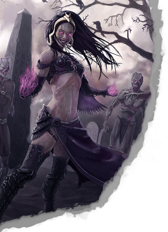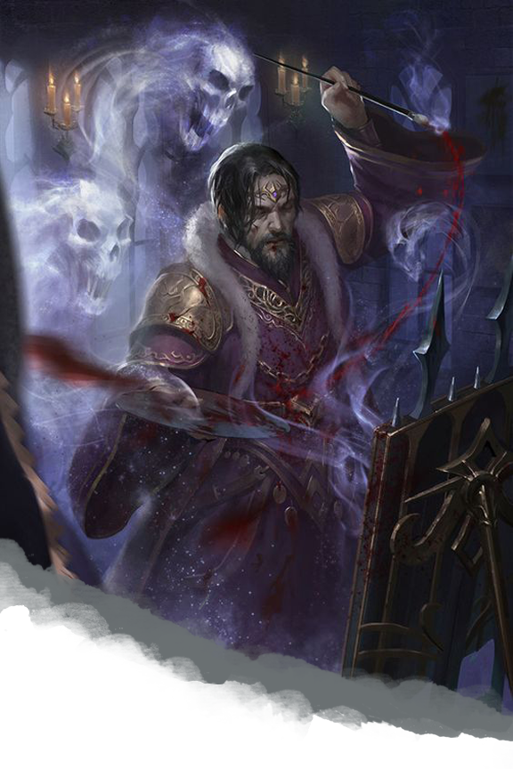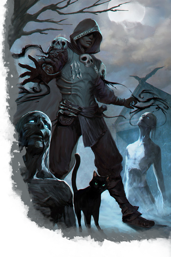 A tall, lanky man outstretches his hands, calling forth the spirits of the dead to come to his aid. The ground roils beneath his feet as leathery hands and bone claws break the surface as skeletons and zombies pull themselves from the soil.