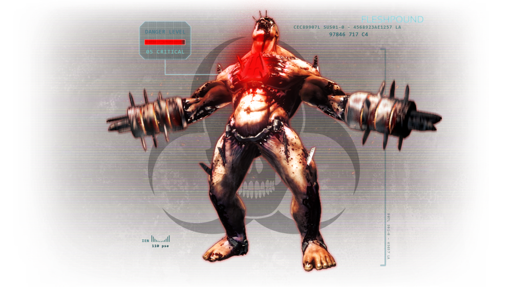 The fleshpound is the epitome of Horzine's experiments. A giant, brutish, hulking mass of muscle and metal, their steps shake th every ground they walk on and a bright light in the center of their chest gives signal of their presence even in the midst of a busy melee.