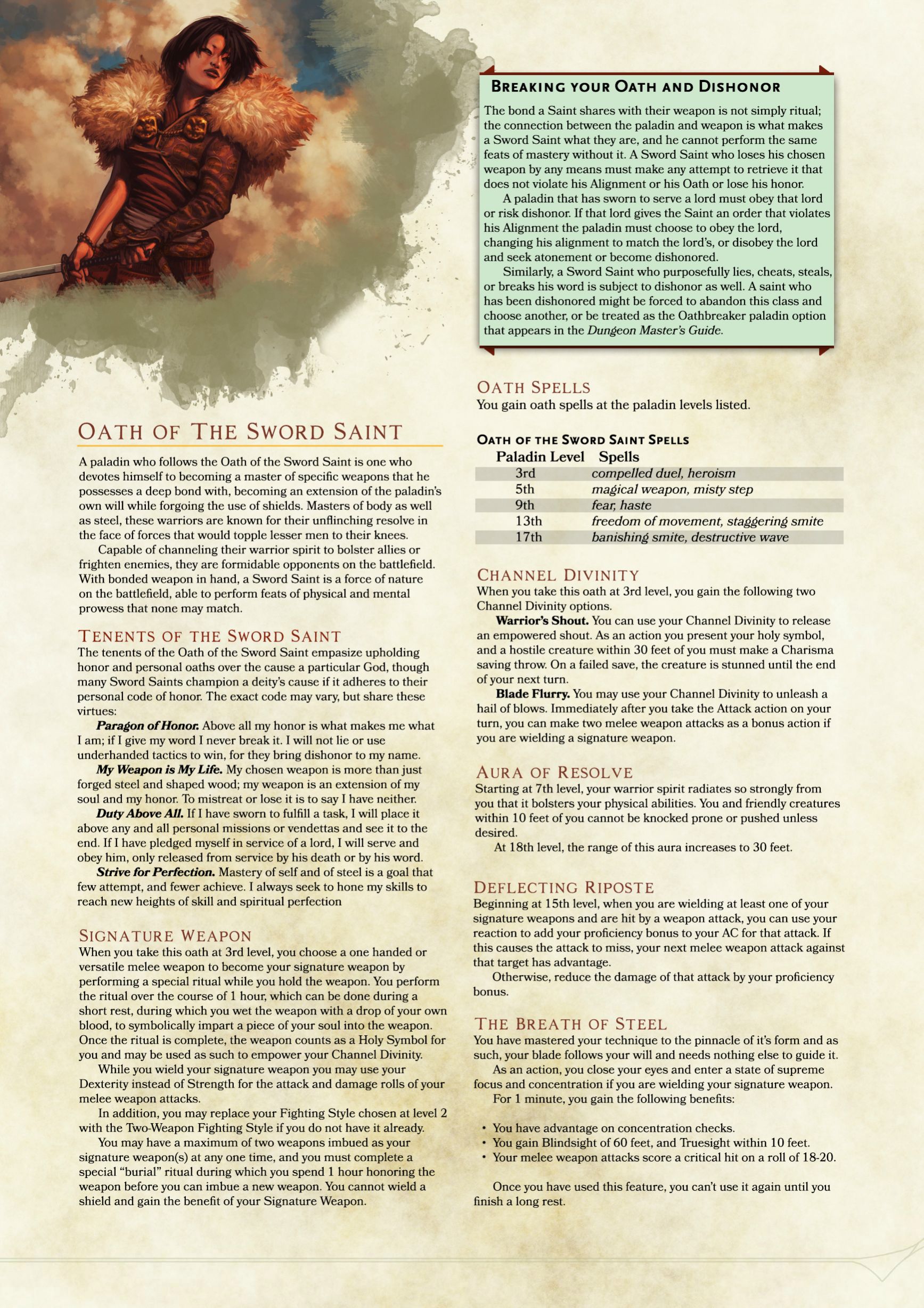 Whatever their origin and their mission, paladins are --united by their oaths to stand against the forces of evil. Whether sworn before a god's altar and the witness of a priest, in a sacred glade before nature spirits and fey beings, or in a moment of desperation and grief with the dead as the only witness, a paladin's oath is a powerful bond. It is a source of power that turns a devout warrior into a blessed champion.