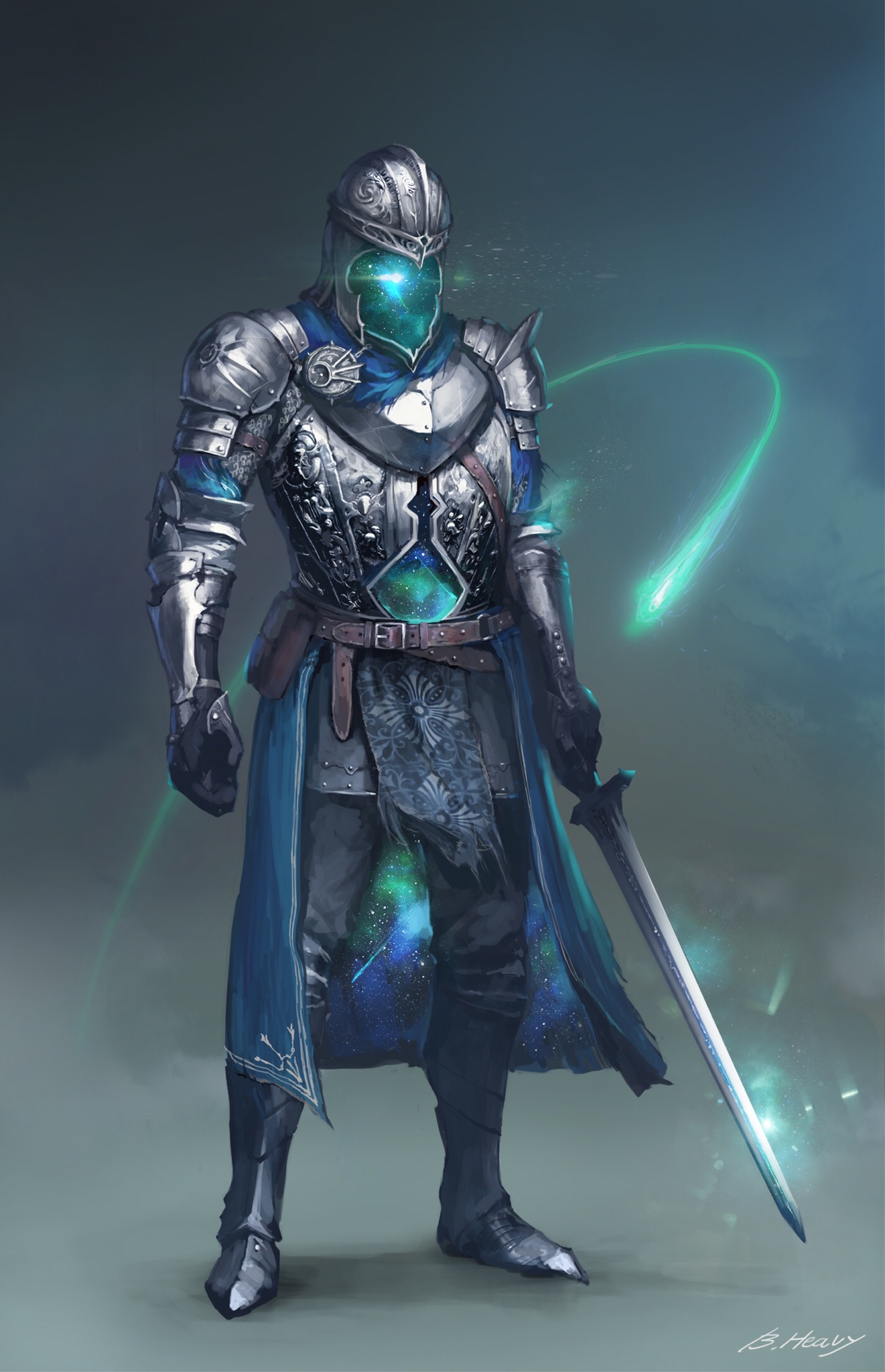 The arrival of a knight is heralded in the night sky, as a meteor shower rains from the heavens with brilliant light comparable to that of the sun. This light then dims and coalesces until all that remains is a faintly glowing humanoid silhouette, clad in simple arms and armour of the finest craft. Orbiting its body is the remnants of the comet on which it arrived, which glows faintly and sheds the same dim light as the knight itself. This small comet serves not only as an eerie reminder of the knights origin, but also as a weapon, which the knight can command and fire like an arrow over great distances.