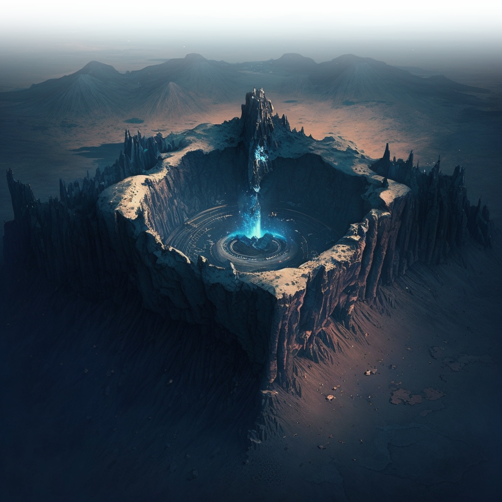 You come to an imploded summit where within a deep crater sits a single decorated crystal column surrounded by rubble from where it sprouted from the ground and some distance away sits a squat stone tower.
