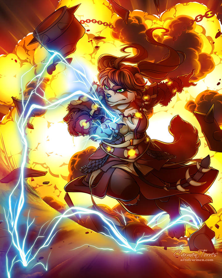 A troll clad in loosely chained together plates and scales reaches her hand high towards storm clouds overhead. After a moment, a blinding streak of lightning arcs from the clouds to her hand, and from there it is sent arcing towards her enemies.
