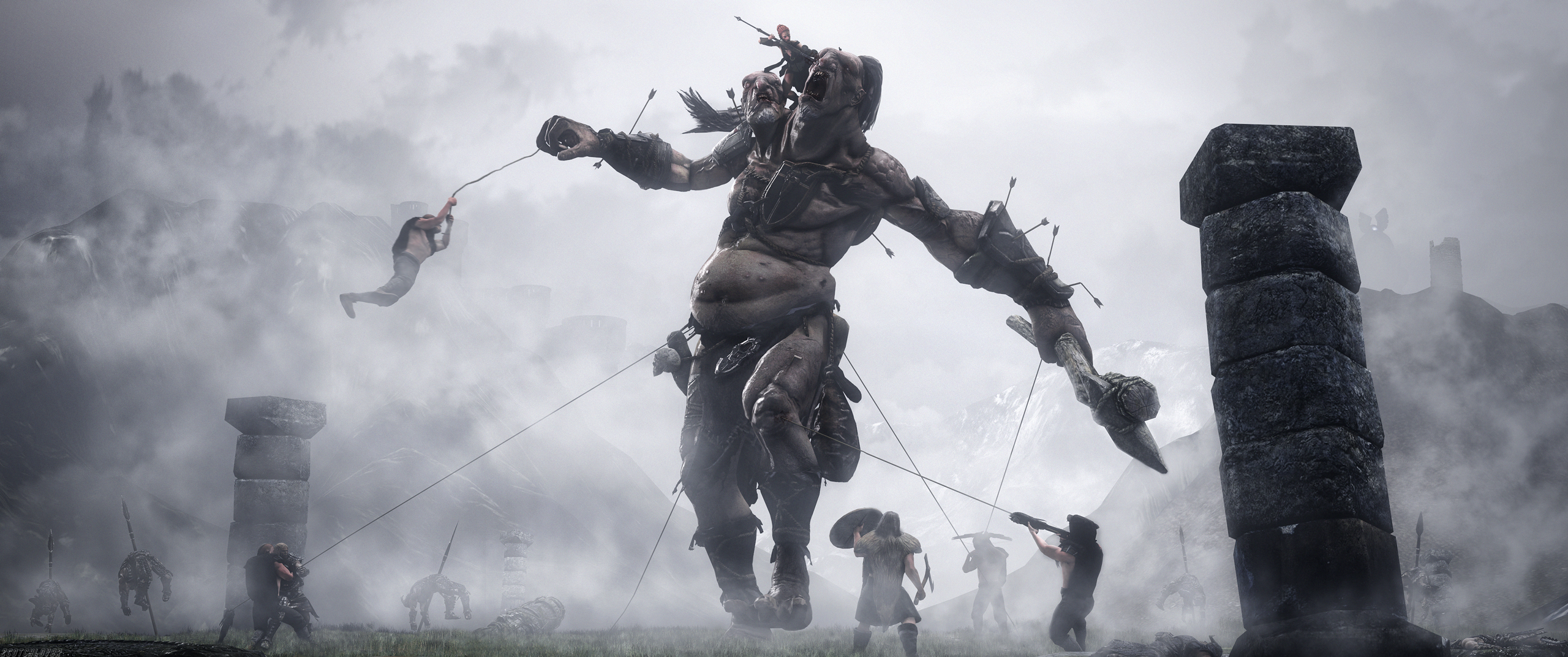 Leaping back, a half-elf narrowly evades a grave blow from a towering stone giant, as its club leaves a large crater in the ground. With deft steps, he darts up the titan's arm, longsword drawn as he rushes for the giant's throat.