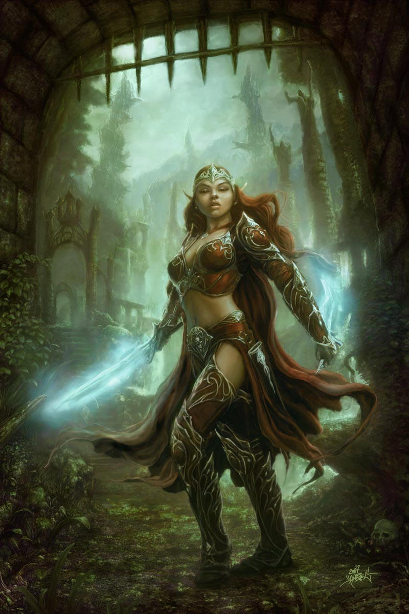 Rough and wild looking, a human stalks alone through the shadows of the trees, hunting a horde of goblins he knows are planning a raid on a nearby farm. Clutching a shortsword in each hand, he becomes a whirlwind of steel, cutting down one enemy after another.