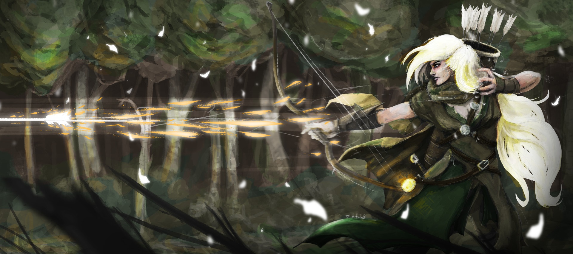 After tumbling away from a cone of freezing air, an elf finds her feet and draws back her bow to loose an arrow at the white dragon. Shrugging off the wave of fear that emanates from the dragon like the cold of its breath, she sends one arrow after another, sundering the dragon's thick scales.
