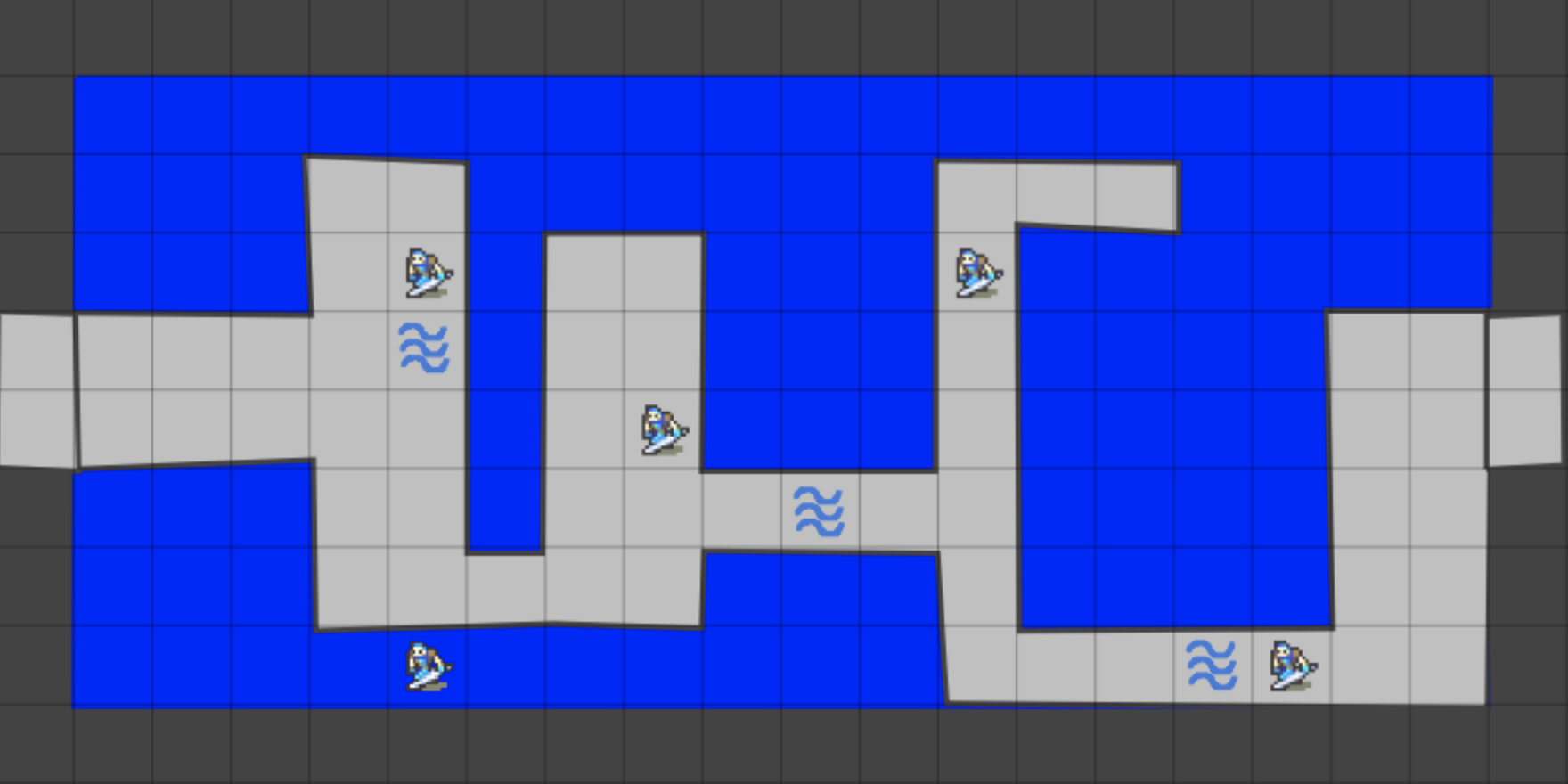 The next room is fully lit. Feel free to share the battlemap with the party. Besides the stone walkways, the room is filled with water 8-10 feet deep (thus requiring a swim check to move faster than half movement).