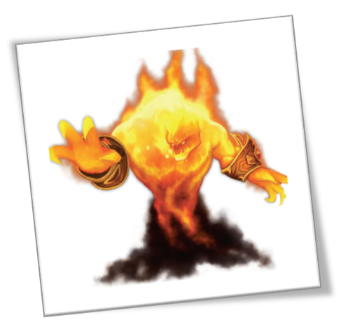 In the center of a 30-by-30 ft room, you spot an unlit clawfoot brazier with two ornate, brass bracelets lying next to it. Once you enter the room, the door behind you slams shut and the brazier lights itself. Suddenly and quickly, the flame grows larger and becomes a vague humanoid figure. The bracelets are filled with fiery limbs and soon you find yourself facing the Gauntlet's final challenge: a fiery elemental creature.