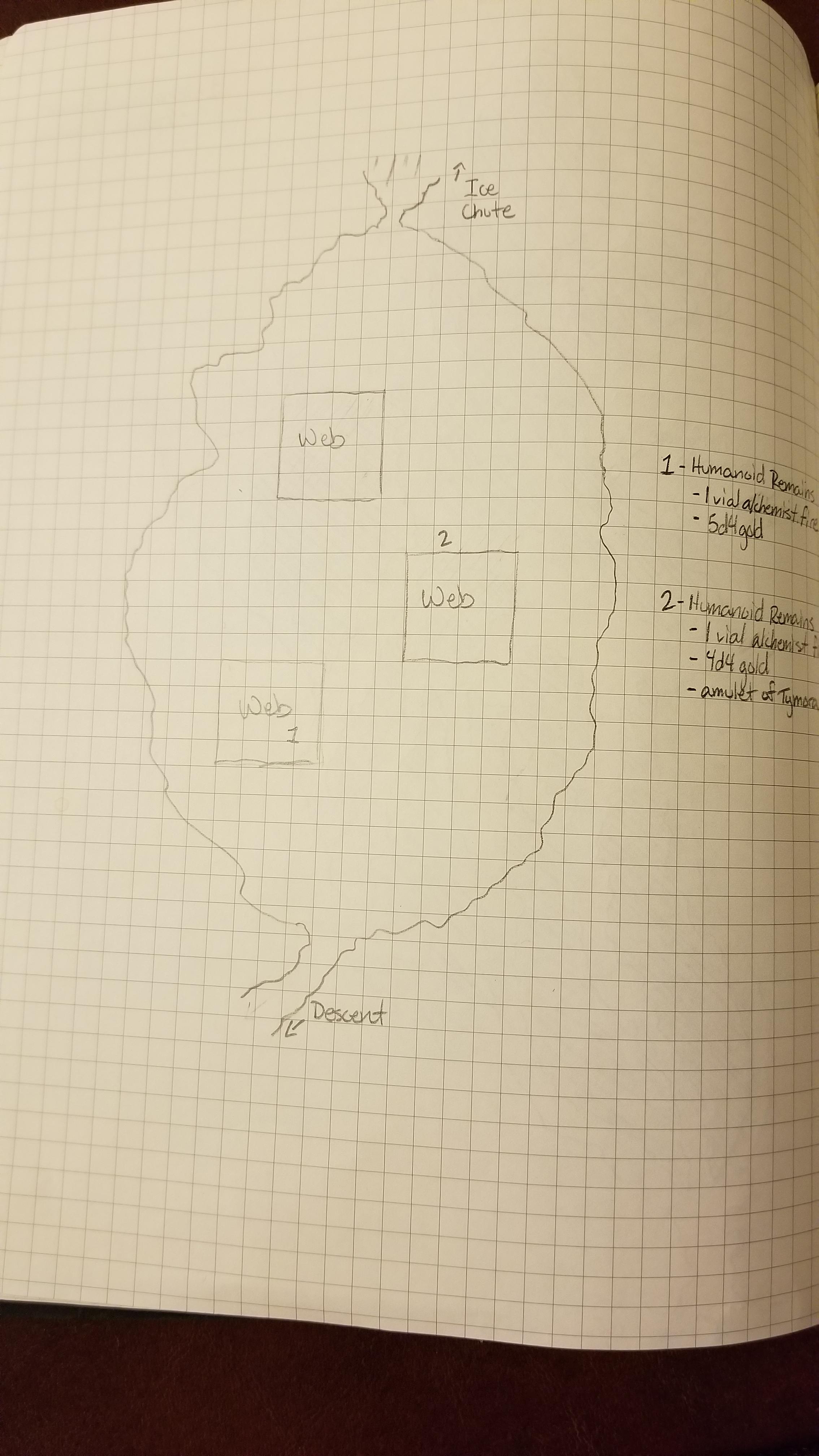 This oblong room is covered in beautiful, glittering lines of ice that sparkle against any lightsource, at grim juxtaposition with the various humanoid remains scattered throughout the room. There are three Rimeweavers (Appendix A) in this room at various points on the ceiling above the web zones on the floor, hidden between stalactites. Below them are 10ft. radius areas where the floor is layered with icy silk (DC 15 perception or investigation to spot); stepping inside the area will prevent the character from moving unless they make a DC 14 Strength check, and will prompt the Rimeweaver above to make an icy javelin attack. After dispatching or circumventing them, an opening at the other end of the room will drop the party into an ice chute.