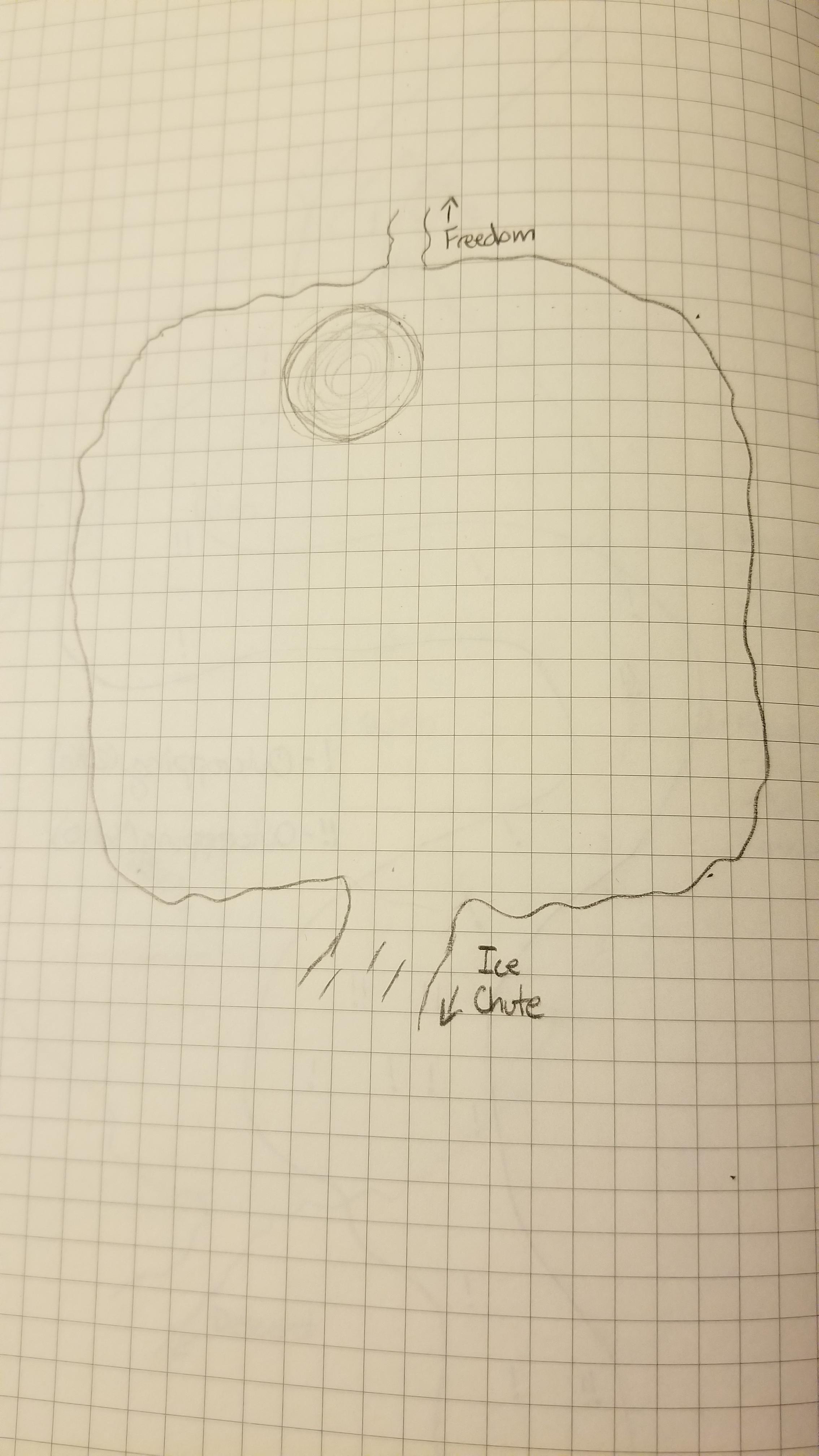 This 80x80 room is roughly circular, and a smell of death clings to your senses. There is a large 20x20 ritual circle at the far end of the room, a miniature raging blizzard around its perimeter. Just beyond it is another cave opening. The Curse is tending it when the party arrives, and will not immediately notice them.